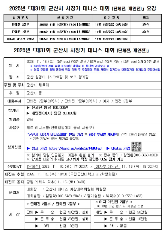 군산시장배 테니스대회를 11월 15일에 개최합니다.