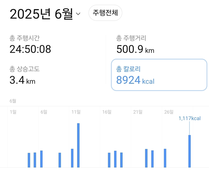 6월 한달간 자출 11일에 라이딩 1회하여 총 500.9km를 주행했고, 8924칼로리를 소모했다고 카카오맵이 정리해줬다.