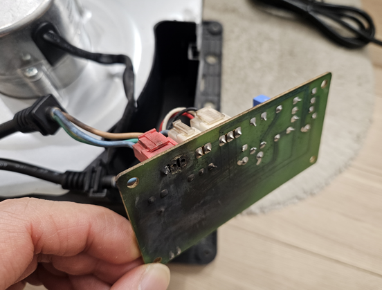 고장난 환풍기를 해체하고 기판을 보니 전원부에서 쇼트가 확인된다. 불날 뻔한 건가^^;