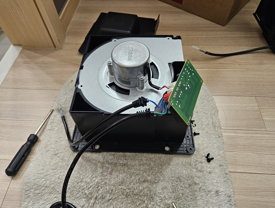 오예~ 기판에 전원선이 커넥터로 연결되어 있다. ㅎㅎㅎ 살포시 빼내서 옆에 놓고 고장 난 환풍기를 해체했다.